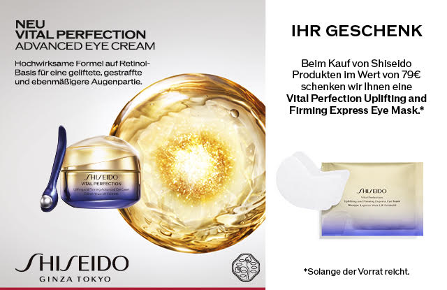 Beim Kauf von Shiseido Produkten im Wert von 79 € schenken wir Ihnen eine Vital Perfection Upflifting and Firming Express Eye Mask.(Solange der Vorrat reicht. Gültig vom 15. bis bis einschließlich 28. Oktober 2025. Pro Kunde nur ein Geschenk.)